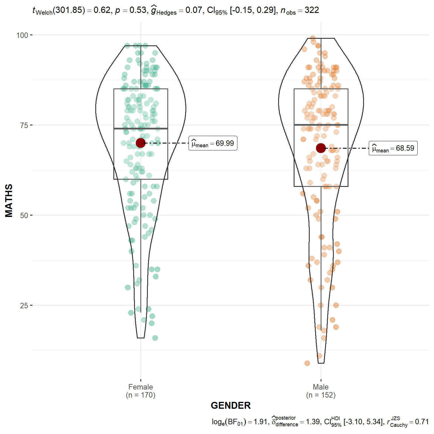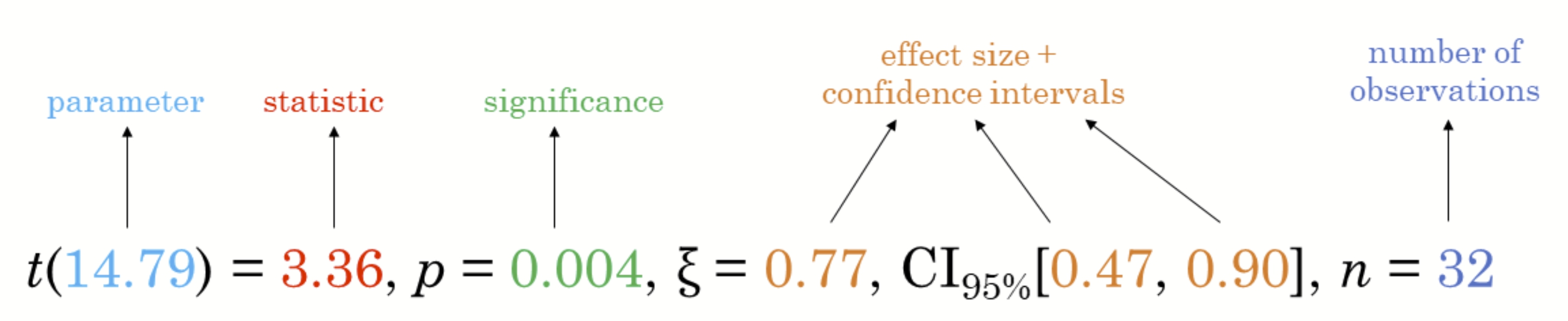 • For all statistical tests reported in the plots, the default template abides by the APA gold standard for statistical reporting. For example, here are results from a robust t-test: