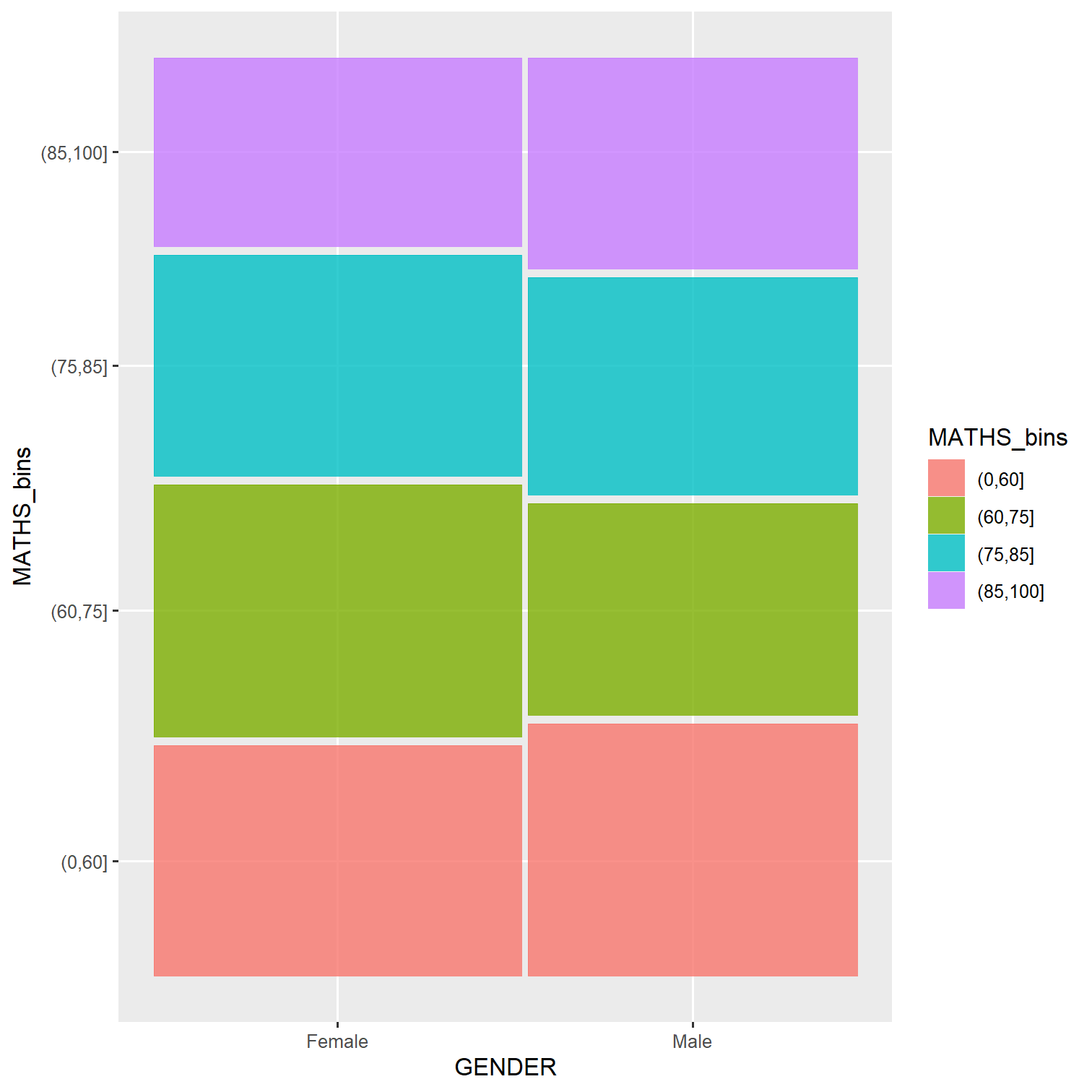 Mosaic plot showing the association between two categorical variables.